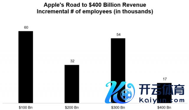 苹果:苹果在 2011 年达成首个 1000 亿好意思元营收时,就只消 6 万名职工。接下来新增 1000 亿好意思元营收,所需的新增职工数仅为一半(3.2 万)。而最近一次新增 1000 亿好意思元营收(从 3000 亿到 4000 亿),苹果只增多了约 1.7 万名职工 。