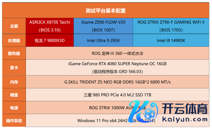 本次测试平台与锐龙7 9800X3D搭配的来自华擎的X870E主板,行动对比,咱们同期组建了i9-14900K和Ultra 9 285K两个平台进行测试。显卡使用iGame GeForce RTX 4080 SUPER Neptune OC 16GB,内存和固态硬盘均为并吞建立。操作系统继承Windows 11 Pro x64 24H2(版块26100.2033),扫数硬件驱动均使用官方最新驱动模范。