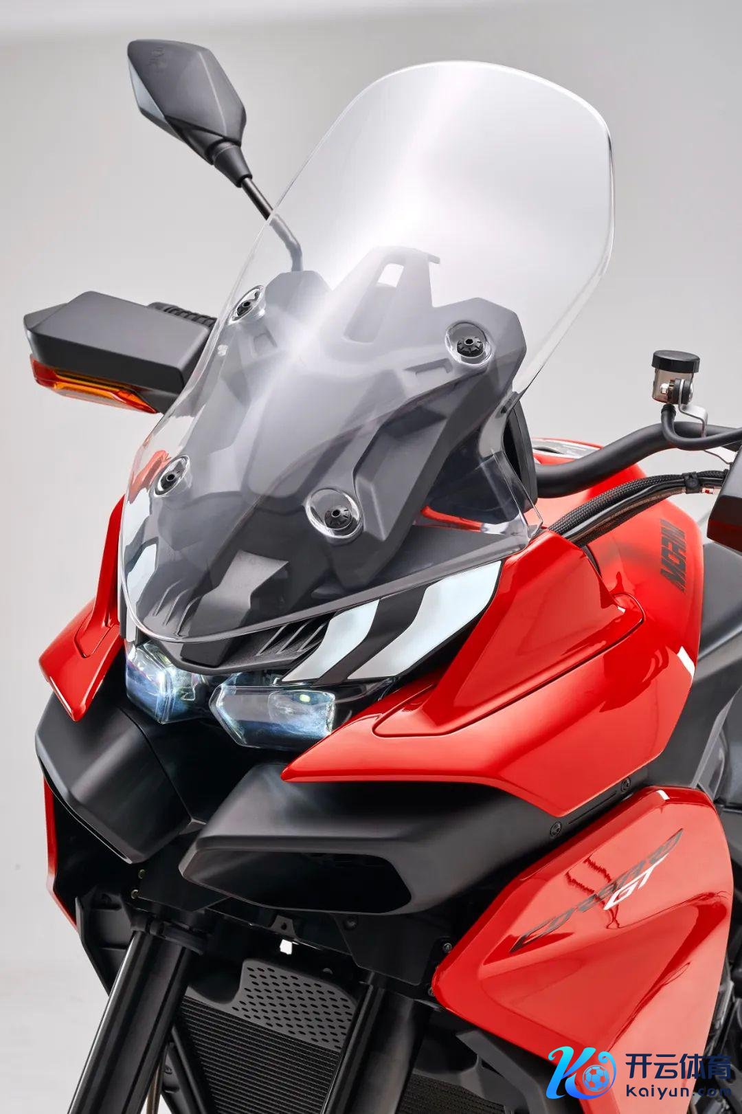 车头部分相等引东谈主扫视,双圆灯不禁让东谈主念念起Corsaro车型的记号性贪图,看起来双圆灯主要认真铺路照明,而其上方的折线型灯带则认真白天行车灯/转向灯等组合功能。前21后17的辐条轮组搭配大颗粒的公路越野两用轮胎,让东谈主有离开公路拥抱当然的冲动。