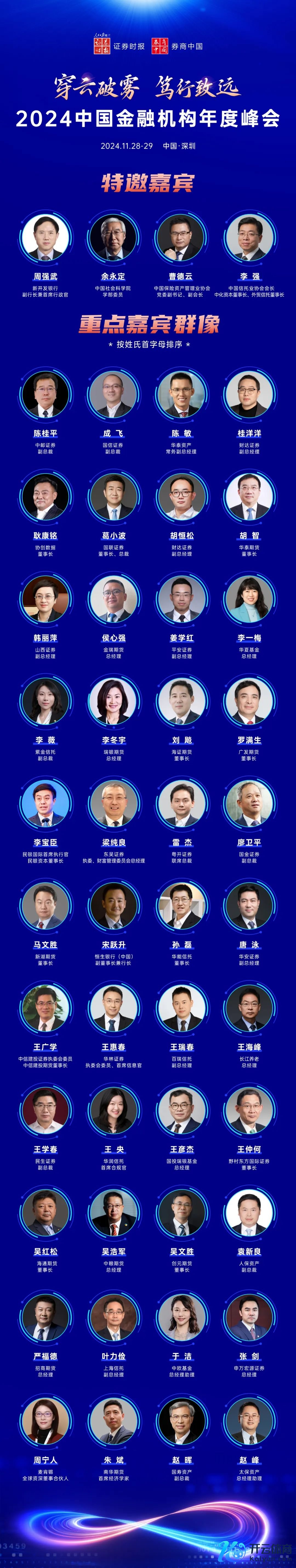 证券时报社将于11月28日—29日在深圳举办“2024中国金融机构年度峰会”,以及“中国银行业年会、中国证券业金钱经纪岑岭论坛、中国证券业资产管制岑岭论坛、中国信赖业发展岑岭论坛、中国期货业年会、中国保障业资产欠债管制年会、中国证券业投资银行岑岭论坛”等七个分论坛。本次峰会主题是“穿云破雾 笃行致远”。