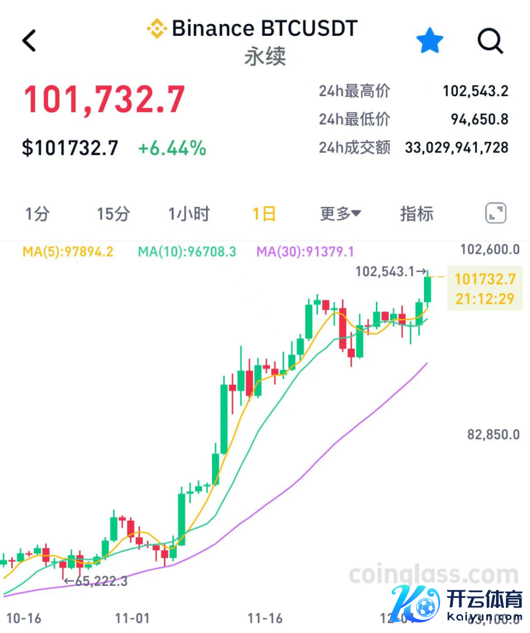 12月5日上昼,比特币(BTC)的价钱攻克10万好意思元大关。结果发稿,比特币最新价钱为101732.7好意思元,24小时内涨幅6.44%。