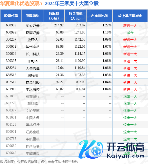 中原量化优选股票A为股票型基金,字据最新一期基金季报显现,该基金金钱竖立:股票占净值比91.99%,无债券类金钱,现款占净值比8.03%。基金十大重仓股如下: